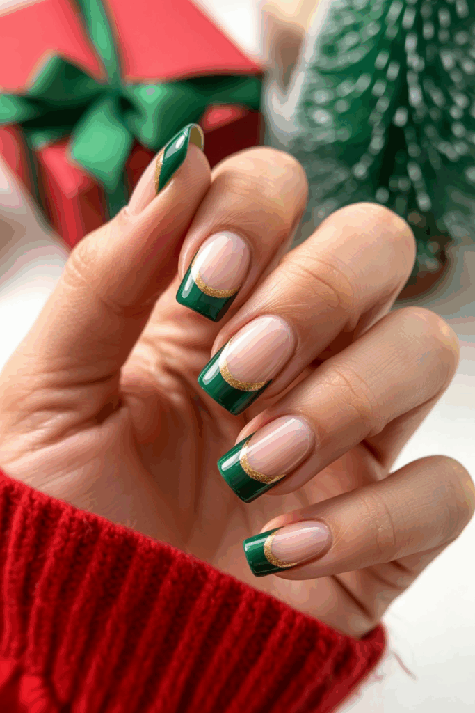 This style flips the usual French tip look by coloring the nail base instead of the tip. Green and gold work well together for a festive but simple design. It adds a fresh twist to classic holiday nails.