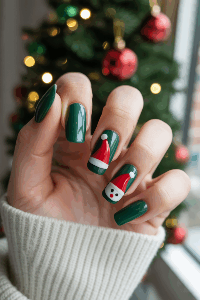 This design uses green nails with a Santa hat accent on one or two fingers. The hats are usually red and white, standing out well against the green background.
