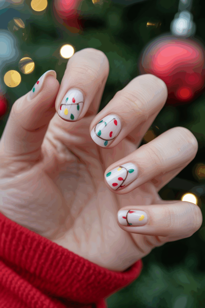 Holiday lights nails use bright, colorful dots and lines that mimic Christmas string lights. They often feature red, green, blue, and white colors on a simple background.
