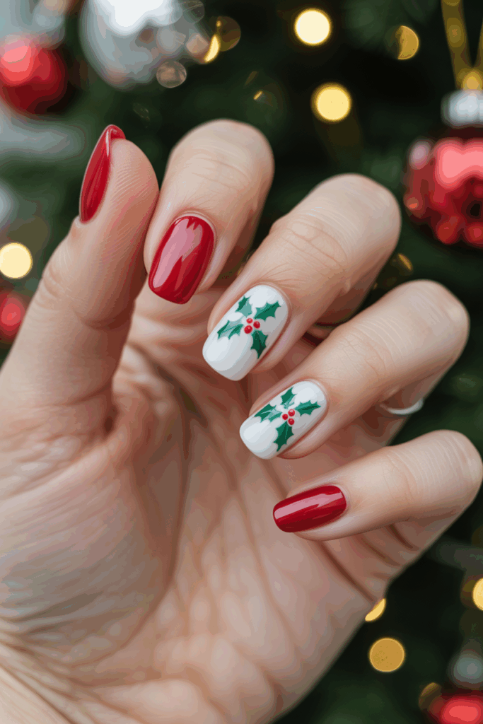 Holly berry accent nails feature small red berries paired with green leaves. They add a simple, festive touch without being too bold. These designs often use a neutral or light background to make the colors stand out clearly.