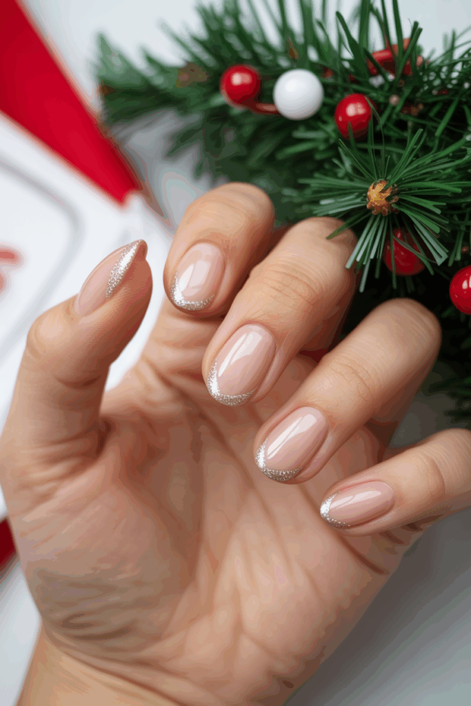 This design uses natural nail space to create a clean look. Glitter outlines add a festive shine without covering the entire nail. It’s simple but festive, suitable for any holiday event.