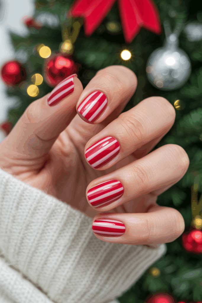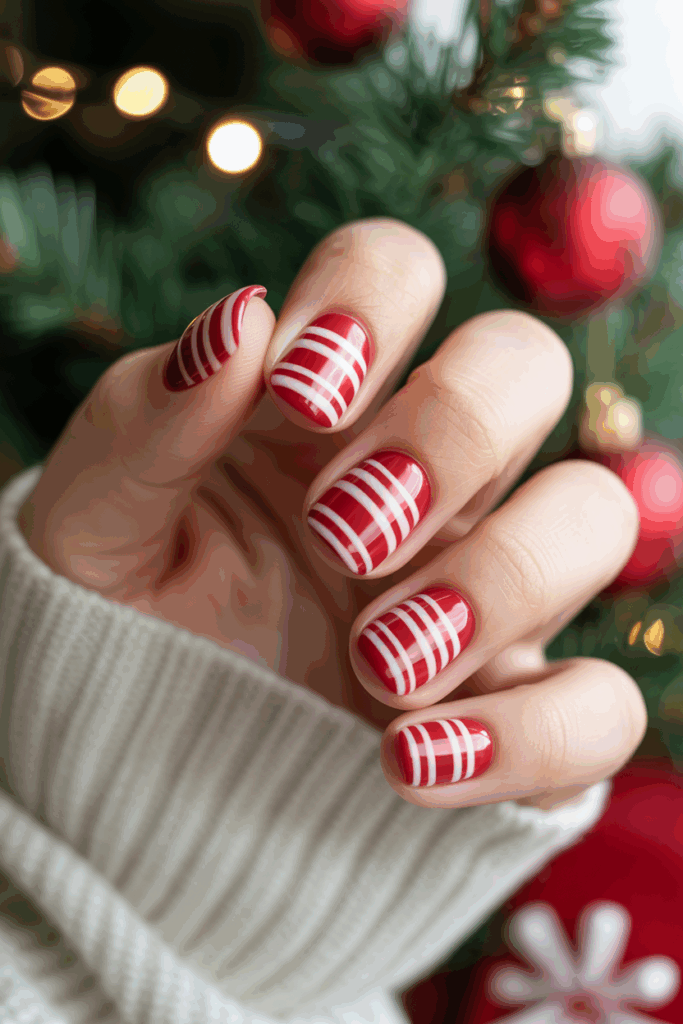 Stripes in red and white are a classic Christmas nail design. They often mimic candy cane patterns, giving a festive look.