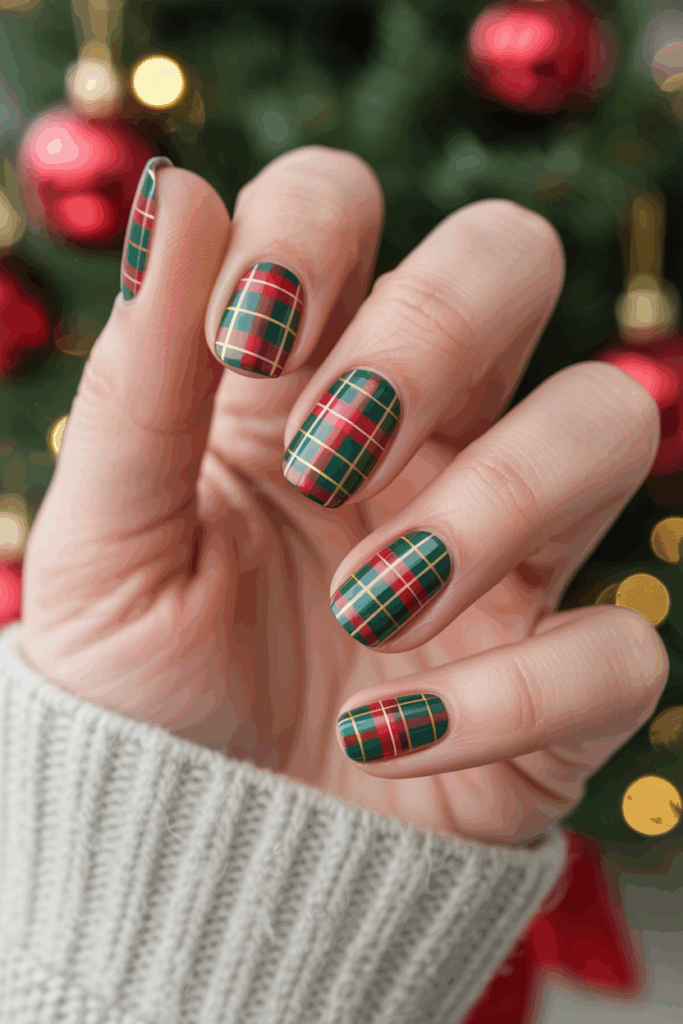 Tartan print nails show a classic, cozy look for Christmas. They use lines in red, green, black, and white to create a plaid pattern.