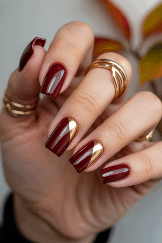 This design features coffin-shaped nails painted in deep red. The tips are finished with a shiny gold chrome for a sharp contrast. It combines elegance with a modern edge, fitting well for fall styles. The look is simple but striking.