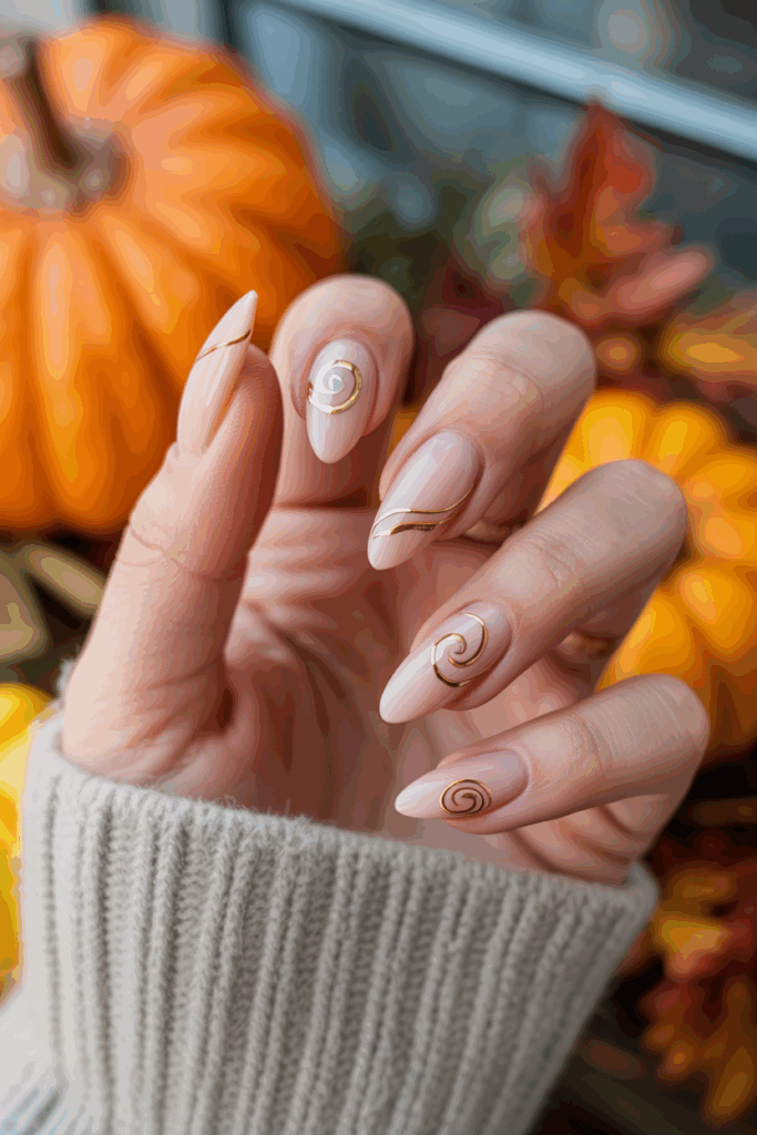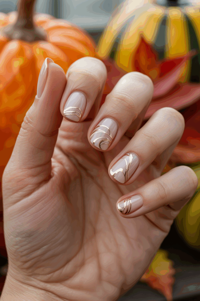 They offer a simple, elegant look perfect for fall. The nude base keeps nails neutral while the gold swirls add a subtle shine. This design suits those who prefer a minimalist style but want a touch of seasonal glam.