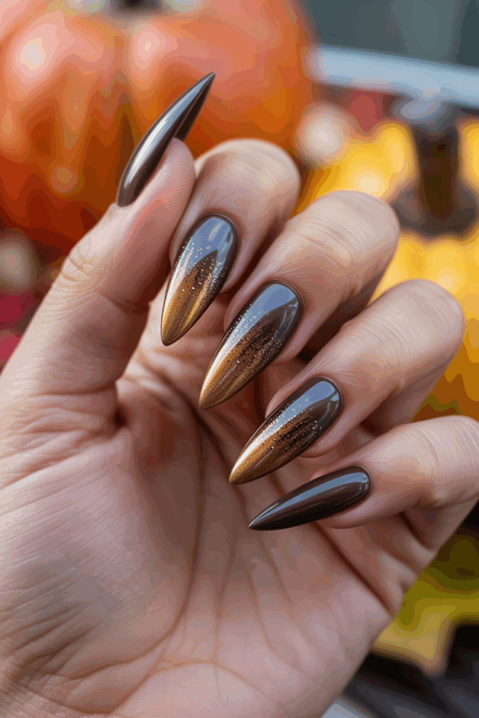 This look blends bronze and gold in a smooth gradient on sharp stiletto nails. It highlights the warm tones of fall with a sleek, modern finish. The gradient adds depth while the stiletto shape brings a bold edge to the design.