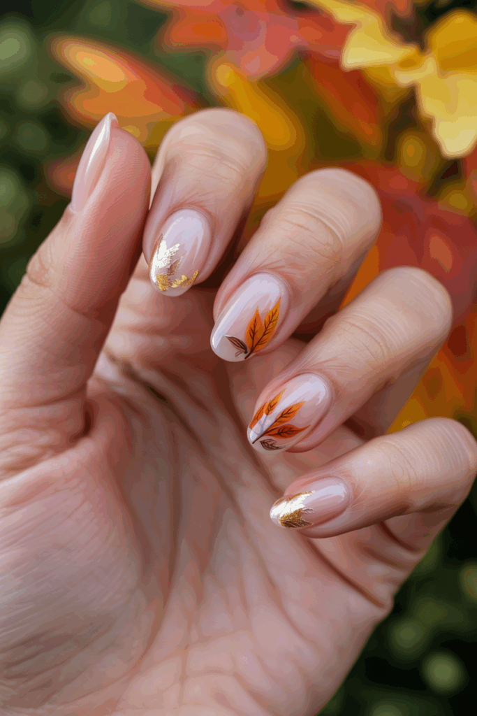 This design uses a clear base to highlight gold leaf accents and small autumn leaves. The look is simple but elegant, blending natural fall colors with shiny gold. It works well for those who want a subtle yet seasonal nail style.