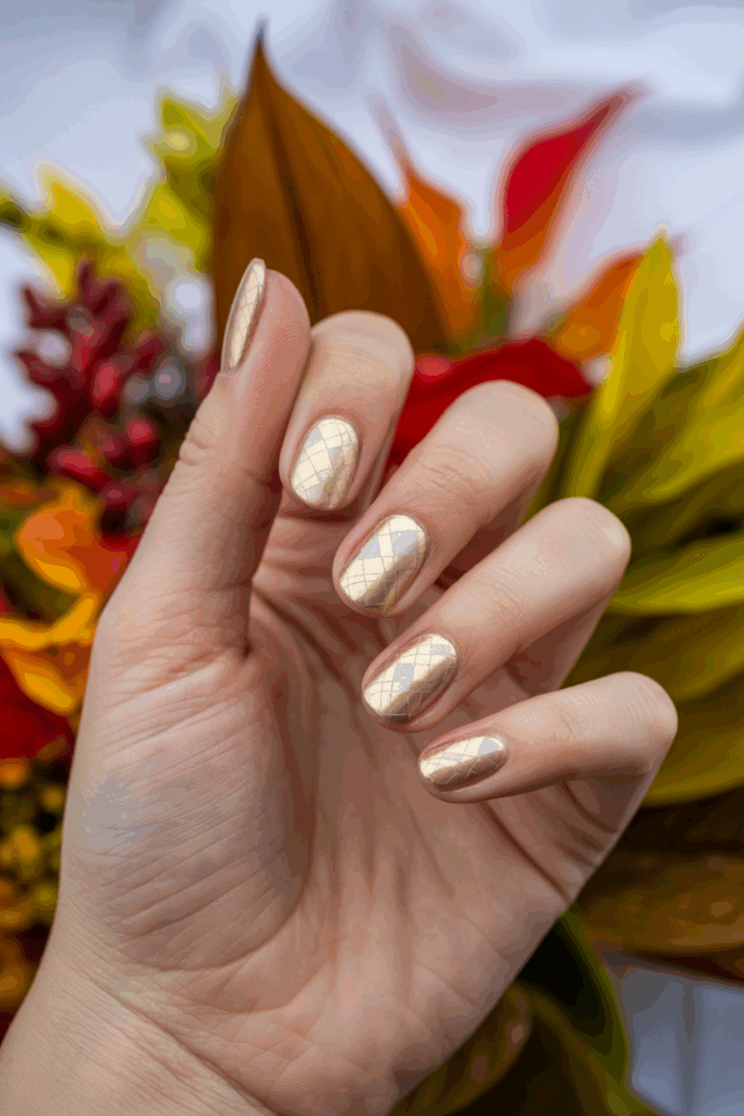 This nail design uses a pale gold gel polish to create a mosaic effect. The look is subtle but adds texture and shine. It works well for fall because it combines warmth with elegance. The gel finish gives a smooth, long-lasting result.