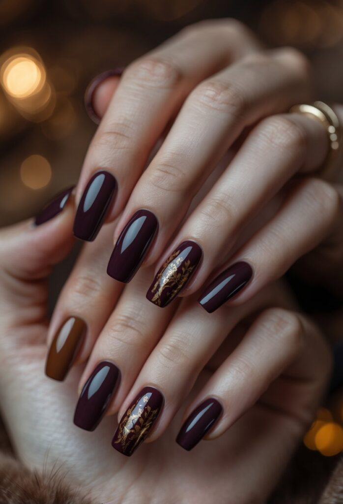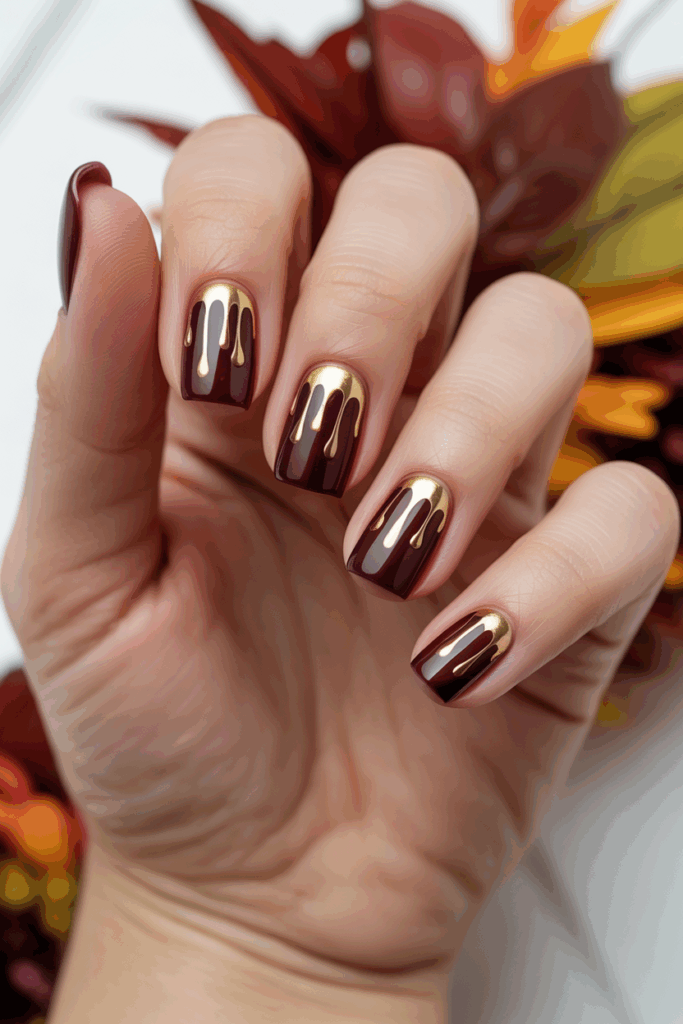 This design pairs deep burgundy nails with a gold drip pattern. The gold looks like it’s melting down the nail, adding a sleek and modern touch. It works well for fall, combining rich colors with a unique, eye-catching detail.