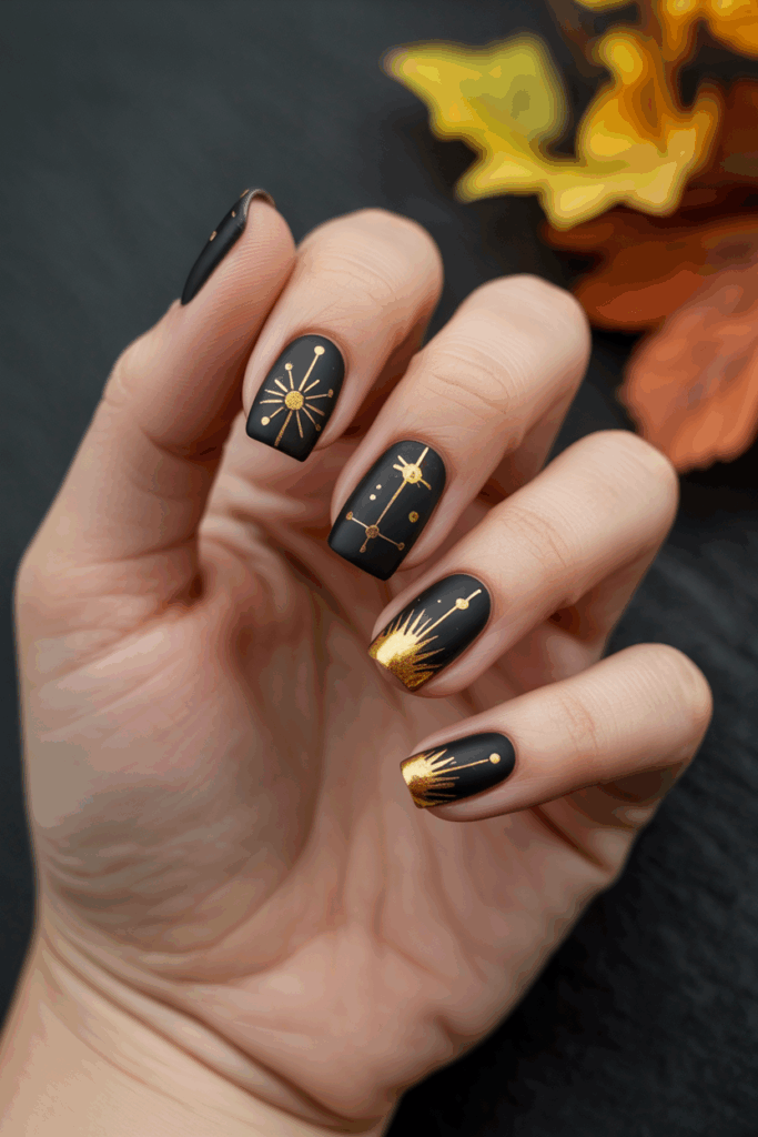 14) Golden Celestial Nail Art on Matte Black Base