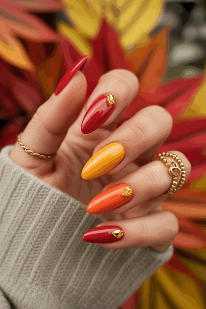 This nail design blends red, orange, and yellow shades to capture the fall palette. Gold gems add a touch of shine and elegance.