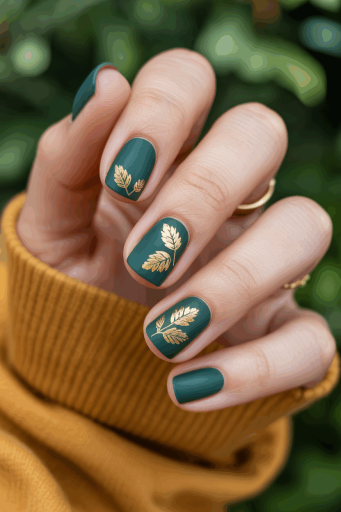 Matte green nails offer a calm and stylish look. Adding gold leaf details creates a subtle shine that fits fall themes well. This design is simple but elegant, making it a popular choice for the season. It works on different nail shapes and lengths.