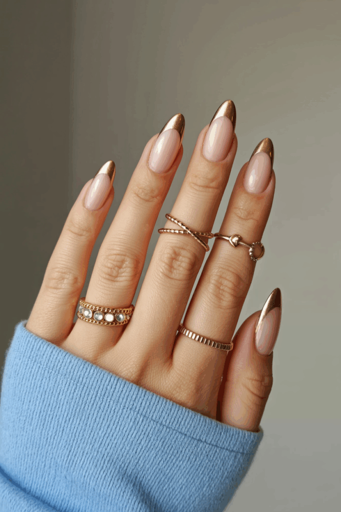 This look combines a sleek metallic gold tip with an almond-shaped nail. The gold adds a subtle shine that pairs well with fall colors. It works for both short and long nails, offering a clean and elegant style.