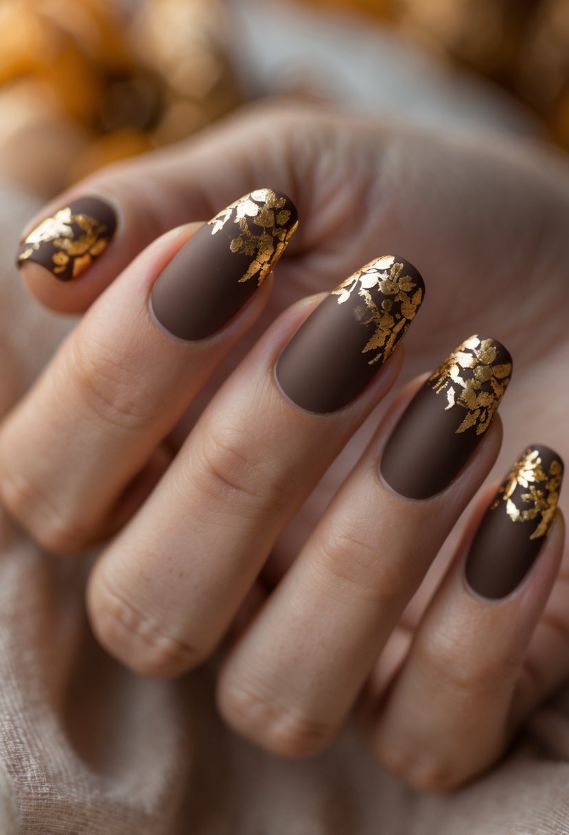 1) Gold Foil Accent Nails with Matte Brown Base