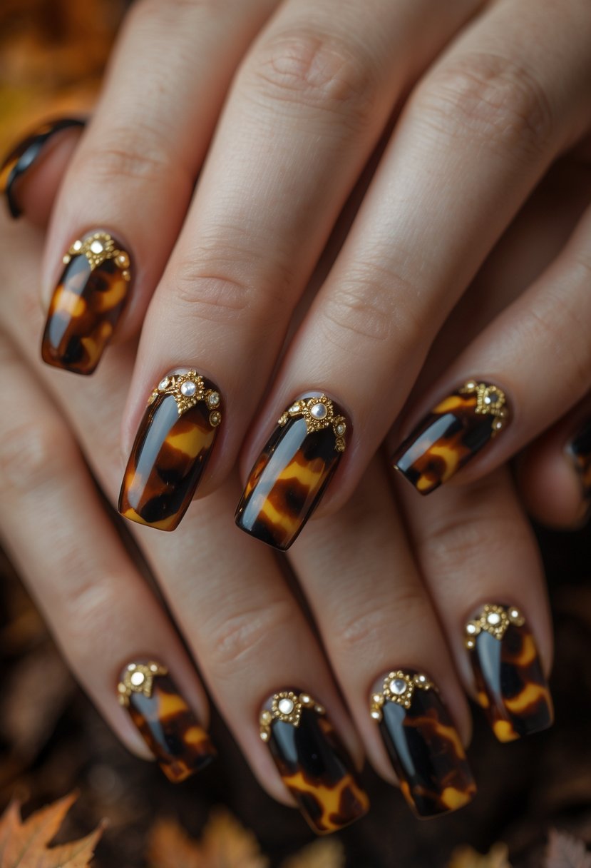 Tortoiseshell nails blend warm browns and blacks to create a classic fall look. Adding gold bejeweled accents gives a touch of elegance and shine. This style suits both casual and formal occasions, making it a versatile choice for autumn.