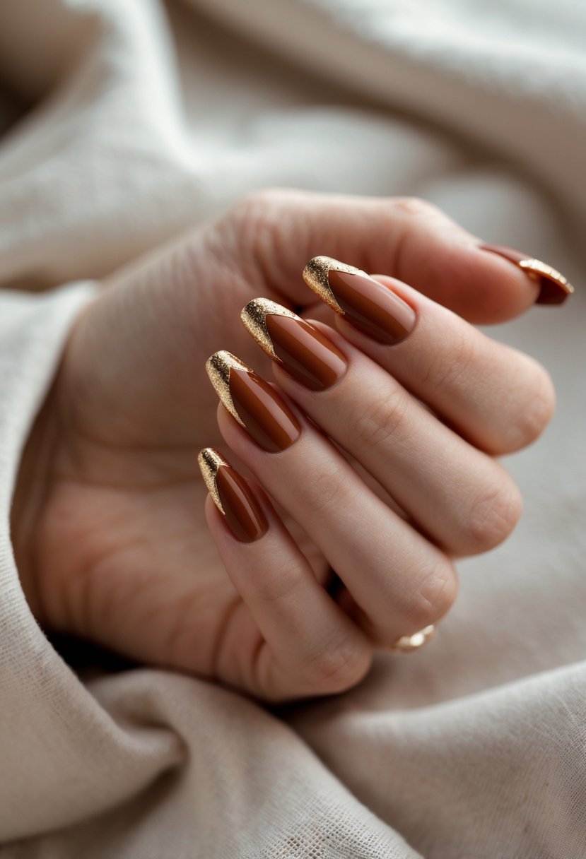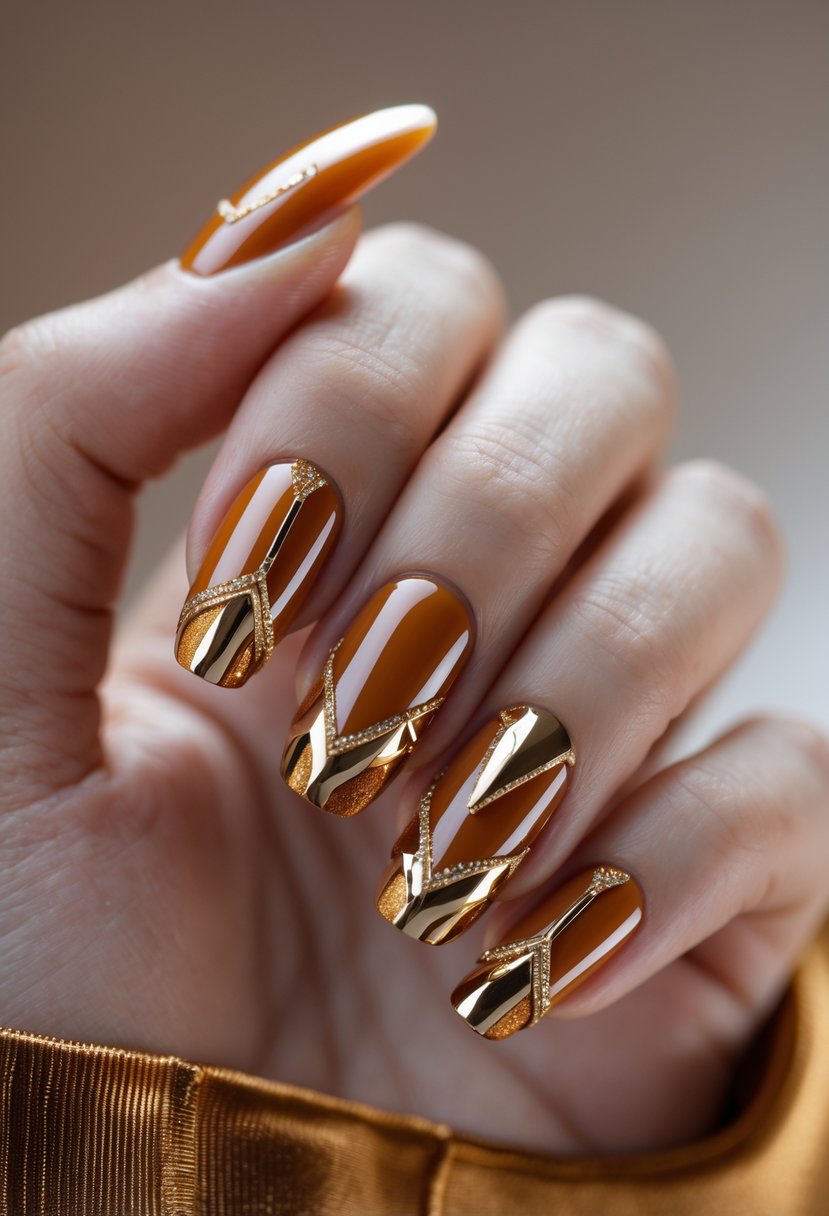 This design pairs rich rust-colored nails with clean gold tips. The warm rust shade highlights the shine of the gold edges. It offers a simple but elegant fall manicure choice that works for many occasions.