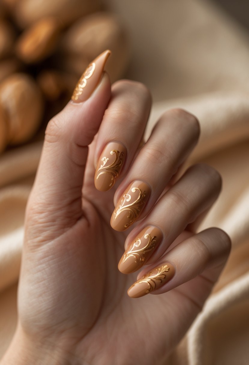 This design combines soft caramel nails with delicate golden swirls. The warm caramel base adds a cozy, autumn feel. Thin gold lines create an elegant swirl pattern that stands out without being too bold. It is simple but stylish for fall.
