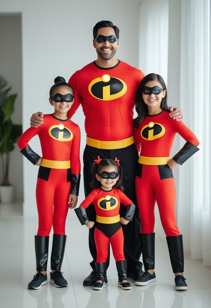 The Incredibles are a natural choice for a family Halloween theme. Each member of the family can wear the iconic red suit with black accents and the “i” logo. The look is instantly recognizable and works for kids and adults of all ages.