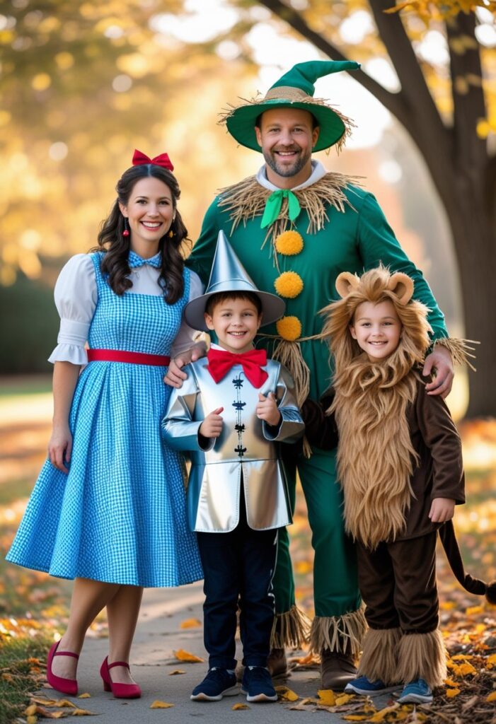 DIY options are easy: gingham dresses, silver spray paint for the Tin Man, or face paint for the Lion. The mix of whimsical and classic makes this idea timeless.