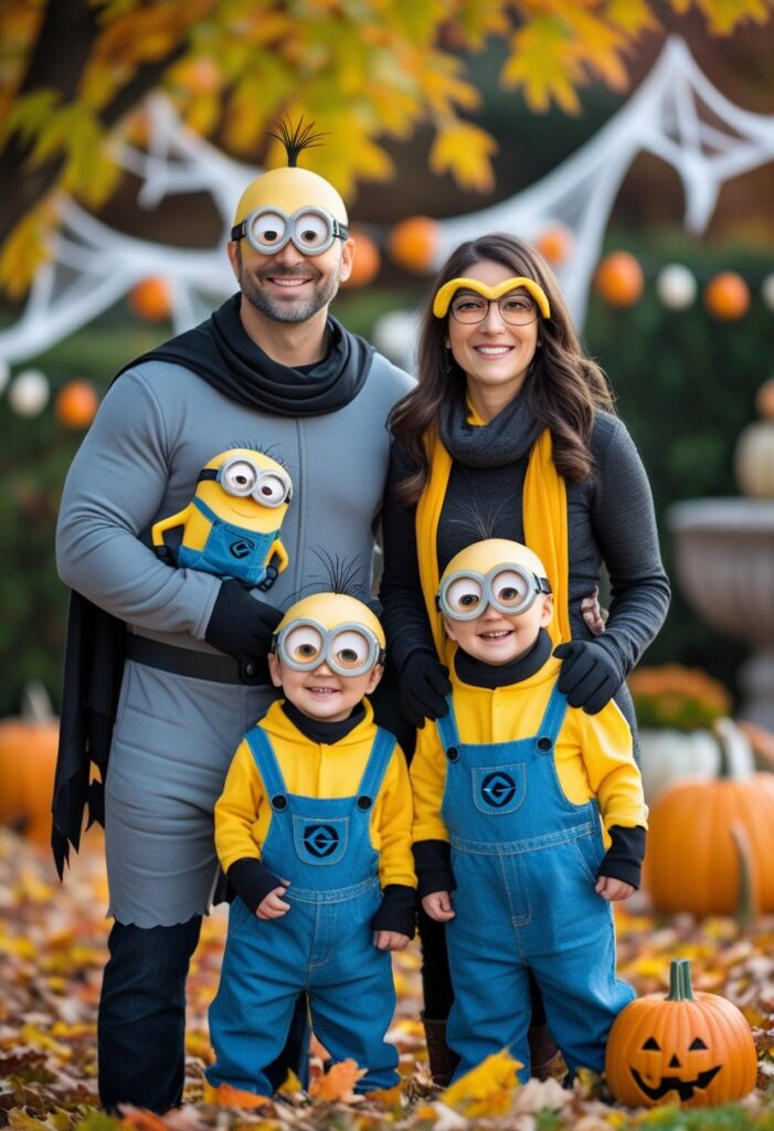 Despicable Me offers a family-friendly costume set with plenty of laughs. Parents can dress as Gru or Lucy, while kids wear yellow shirts, overalls, and goggles to become Minions.