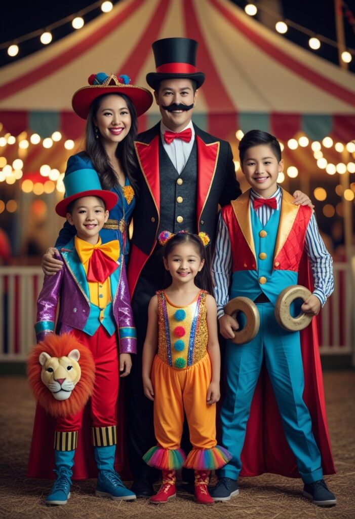 A circus theme is colorful, bold, and flexible. Parents can dress as the ringmaster and fortune teller, while kids become clowns, acrobats, or animals like lions and elephants.