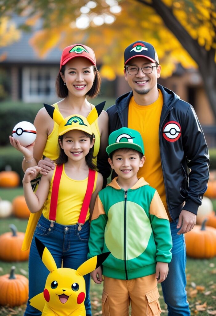 Pokémon is a great family costume idea thanks to its wide range of characters. Parents can dress as trainers like Ash or Misty, while kids can pick their favorite Pokémon.
