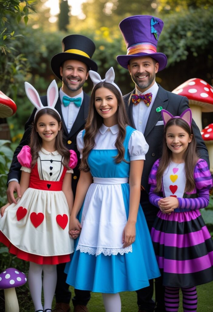 The costumes can be as whimsical or as elaborate as you like, from DIY colorful outfits to detailed store-bought versions. Props like teacups, oversized playing cards, or pocket watches make the group instantly recognizable.