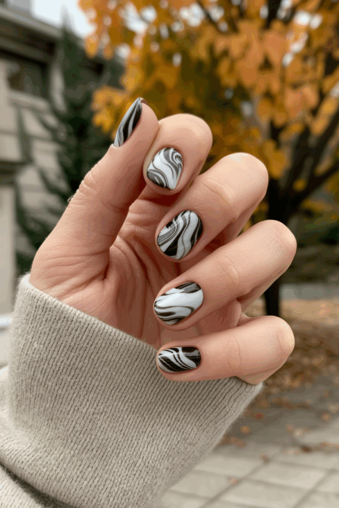 This style uses black swirls on a white base to create a marble effect. It is simple but looks bold and elegant. The design fits well with Halloween while staying classy and versatile.
