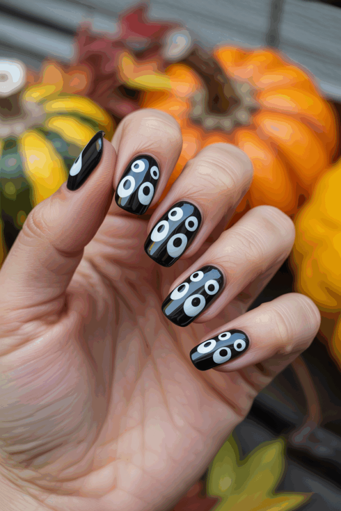This design uses a black base with white polka dots to look like ghostly eyes. The dots are simple but create a spooky effect. It is easy to do at home and fits well with other Halloween styles. The look is both stylish and subtle.