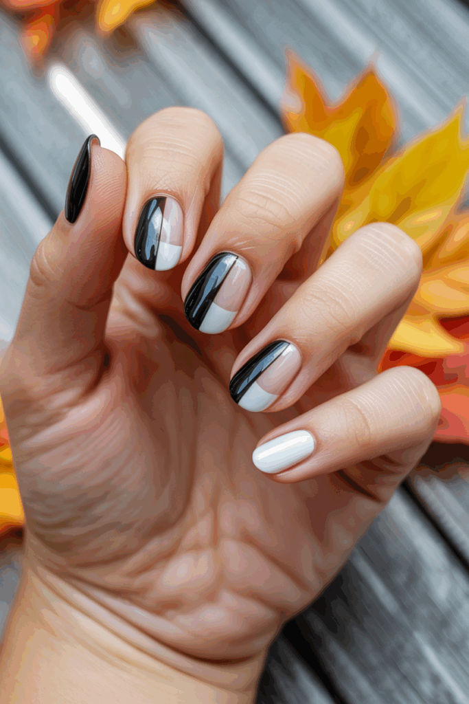 This design splits each nail diagonally into black and white halves. It creates a sharp, clean look with strong contrast. The style is simple but eye-catching, making it perfect for a classic Halloween vibe. The diagonal line adds a modern twist to the traditional half-and-half nail look.
