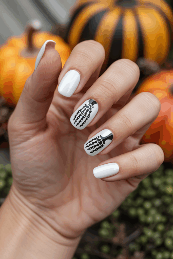 The contrast between black and white keeps the nails bold but not overly complicated. This style works well for those who prefer minimalist designs with a spooky touch.