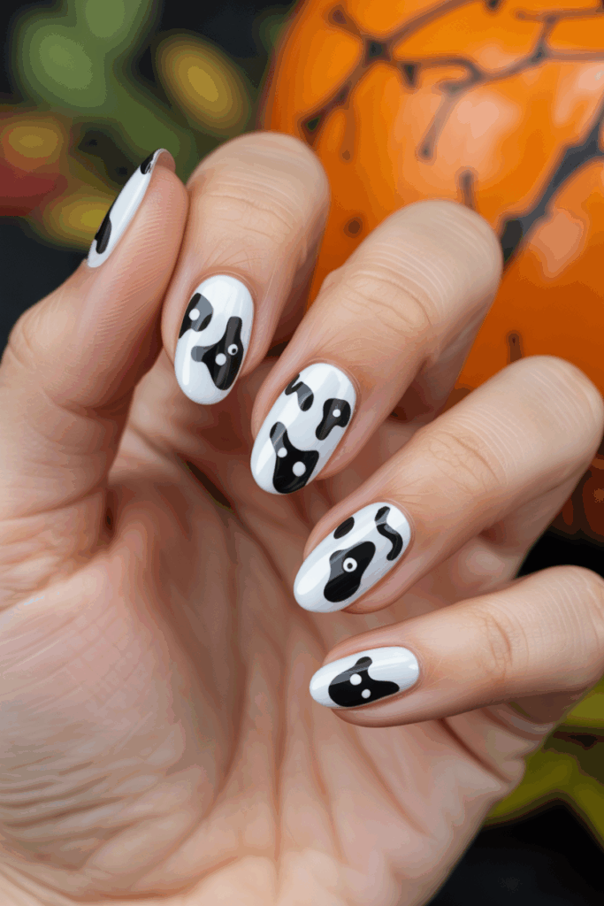 These nails use a clean white base to create a ghostly look. Small black dots and lines form simple faces, keeping the design subtle.