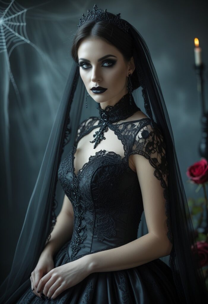 A spooky yet romantic option—black lace gowns paired with veils, dark roses, and pale makeup. It’s a dramatic choice that combines gothic fashion with a haunting bridal theme.