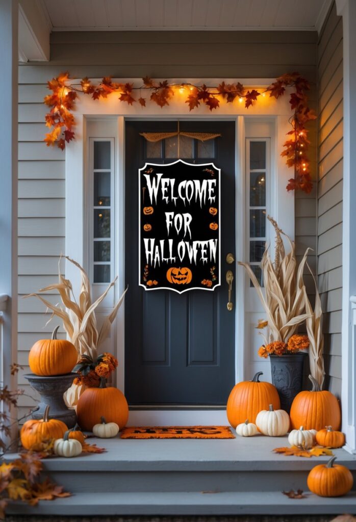 A welcome sign featuring spooky typography sets the tone for Halloween guests. Gothic or eerie fonts enhance the front porch’s Halloween vibe effectively.