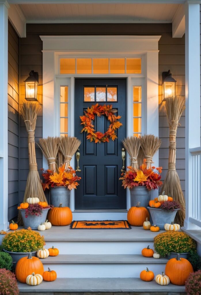Broomsticks positioned in planters create a simple yet effective Halloween display. They add vertical interest and complement seasonal plants like pumpkins or mums.