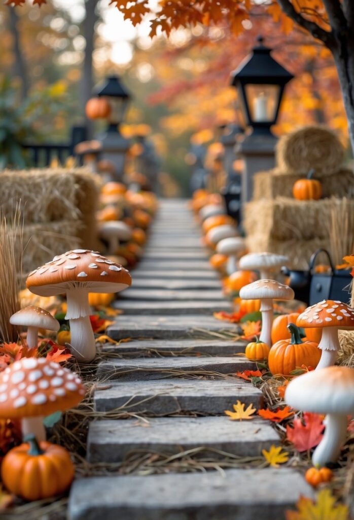 Lining the walkway with faux mushrooms creates a subtle, whimsical touch. It adds a unique element without overwhelming other decorations.