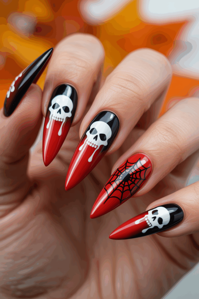 This design is perfect for stiletto nails, which naturally resemble fangs. Paint your base in nude or pale pink for skin tone contrast, then add crisp, triangular red tips for a bold vampire-inspired finish. Glossy top coats give a “fresh bite” shine that ties the look together.