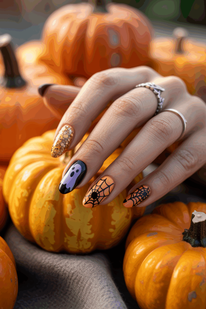 This design combines spider images with detailed web patterns. It offers a classic Halloween look that works on both short and long nails. The contrast between dark and light colors helps the web and spider stand out clearly. Adding small glitter details can enhance the design without overwhelming it.