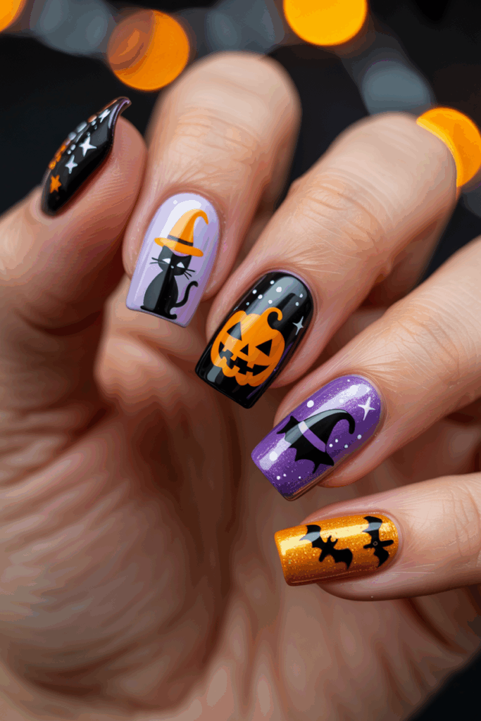 This design feels playful yet chic, offering a nod to Halloween without being overly themed. Try painting your witch hats with a fine brush and accenting them with silver or gold buckles for a little sparkle. Pair the look with dark polish—black, plum, or emerald—for maximum contrast.
