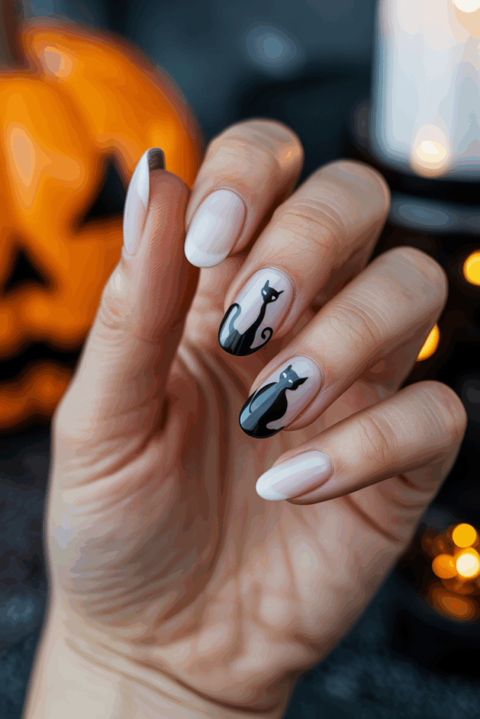 For a bolder statement, add yellow or green eyes using a dotting tool or small brush. The glowing look makes the design come alive—especially under low lighting. It’s perfect for cat lovers or anyone channeling a witchy aesthetic this spooky season.