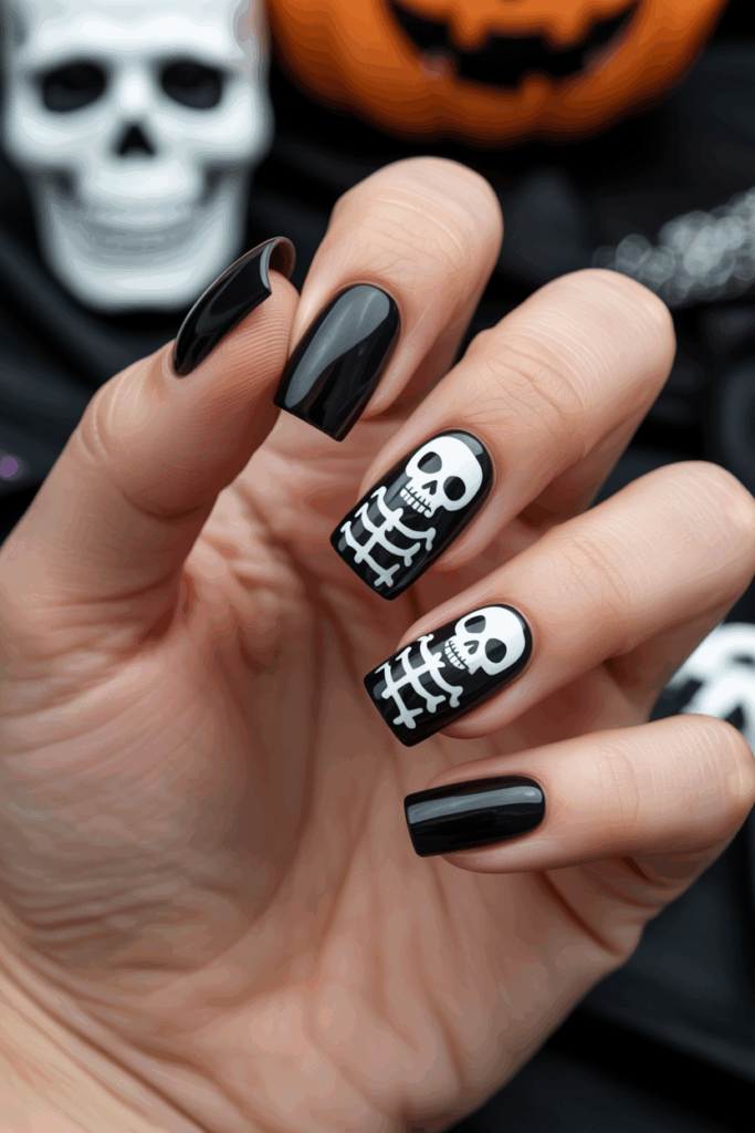 Skeleton nails are both eerie and elegant—a Halloween staple that never goes out of style. You can create the look by painting bone segments across each nail to mimic your hand’s natural anatomy. A matte top coat gives them a chalky, realistic appearance.