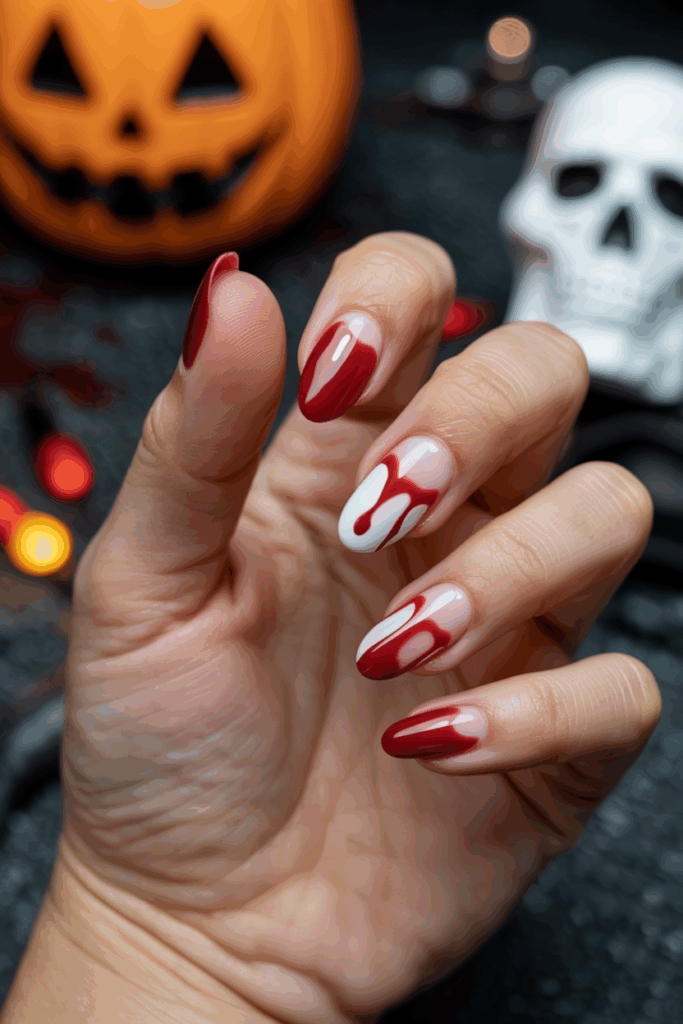 For an extra eerie touch, mix in darker crimson tones or a little shimmer polish for a “wet” effect. Short nails look edgy and subtle, while longer almond or stiletto shapes make the drips appear elongated and more theatrical. It’s an easy way to add spine-chilling glamour without going overboard.