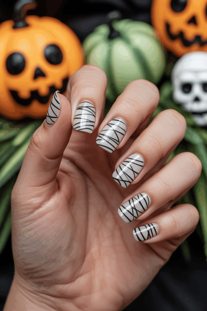 This design looks great on any nail length, and the imperfect lines actually make it better—it’s one of the easiest Halloween looks to do at home. You can freehand the bandages with a fine brush or use striping tape for a cleaner effect. A matte top coat gives it that aged, cloth-like texture.