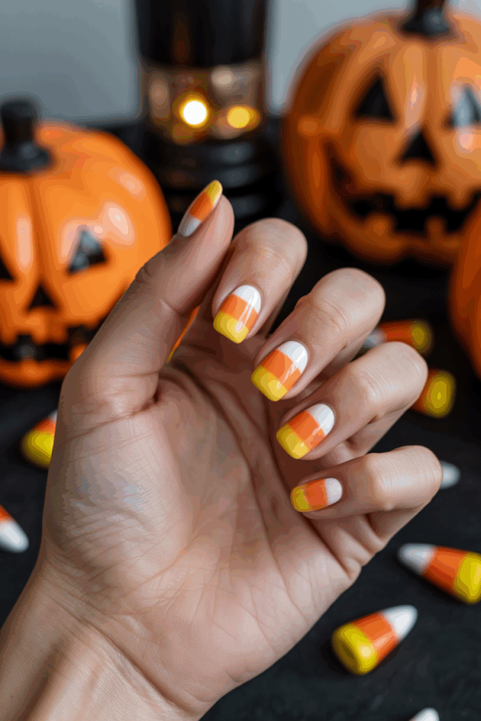 They often use bright orange, yellow, and white to mimic candy corn. These nails bring a playful, festive look for Halloween. Simple stripes or small candy corn shapes work well for easy, fun designs. They fit both casual and party settings during the spooky season.