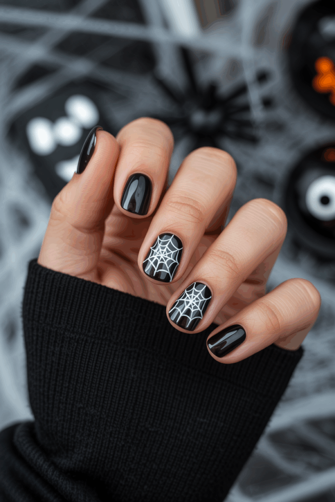 For a glamorous take, try adding micro-glitter over the web or a metallic silver outline that catches the light. Pair this mani with sparkly rings or a black lace outfit for a subtly spooky vibe that feels more sophisticated than scary.