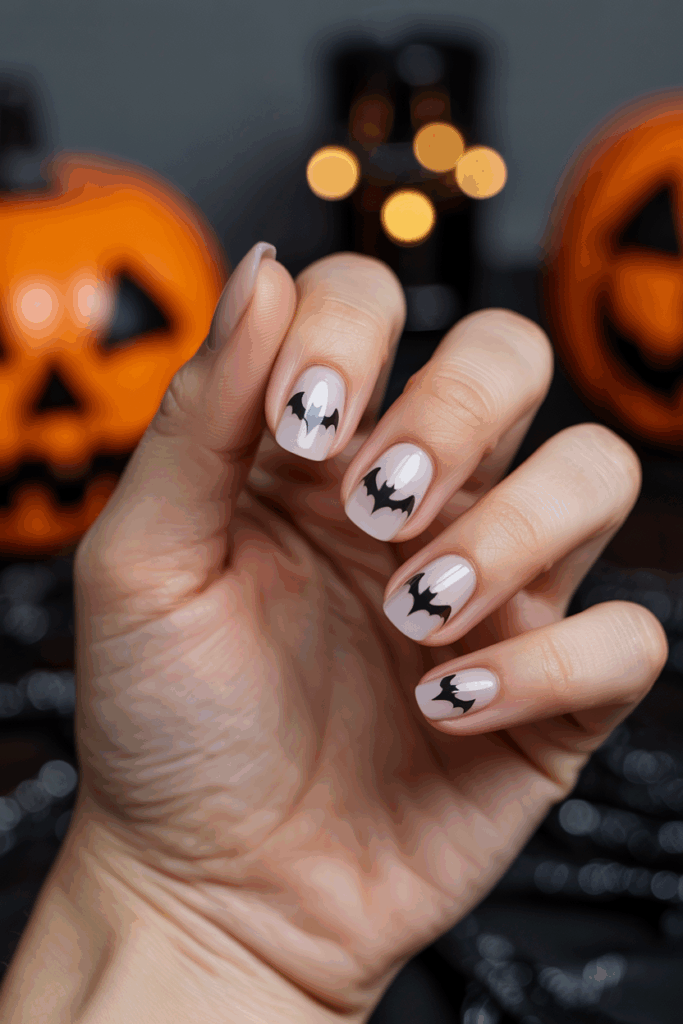 Bat wing silhouettes use simple, dark shapes to create a spooky yet elegant look. They work well on any nail shape, especially on almond or stiletto nails. This design pairs well with classic Halloween colors like black, orange, and deep purple for a festive touch.