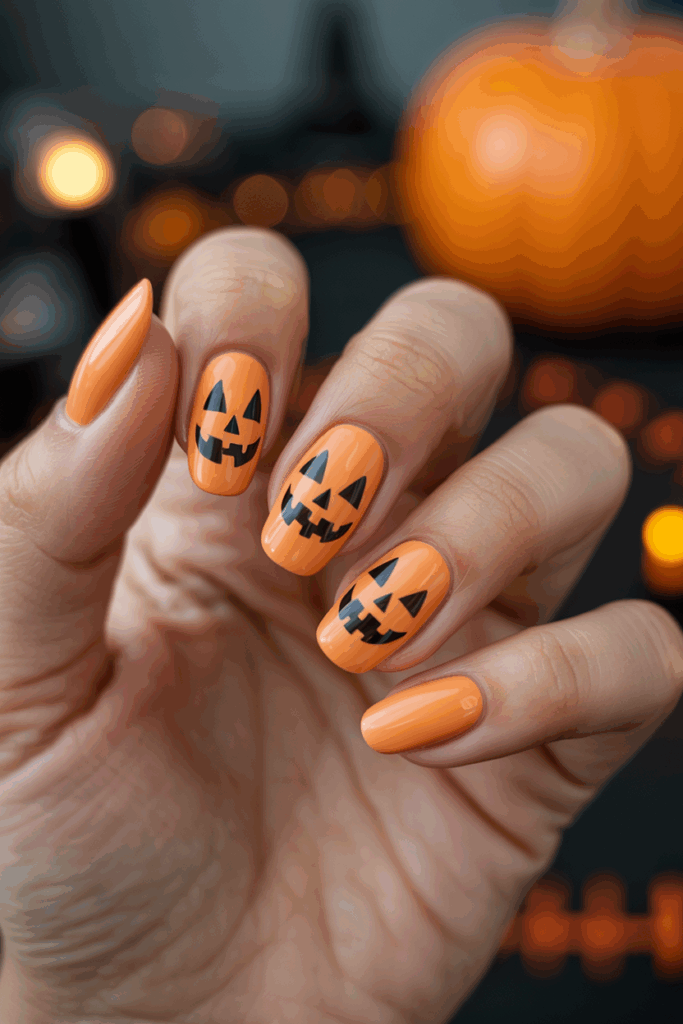 Pumpkin face nails show simple jack-o’-lantern designs on each nail. They often use orange polish with black or white for the faces.
