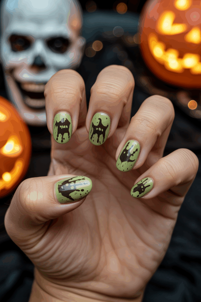 Ghost nails are a fun balance of cute and creepy. Paint soft white shapes with rounded edges for friendly ghosts or sharper edges for a scarier version. A black, gray, or deep purple background helps them stand out, while a glossy top coat keeps the ghosts from looking flat.