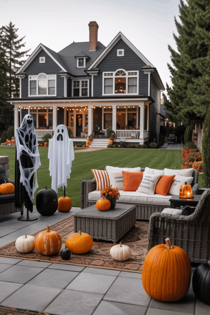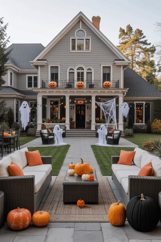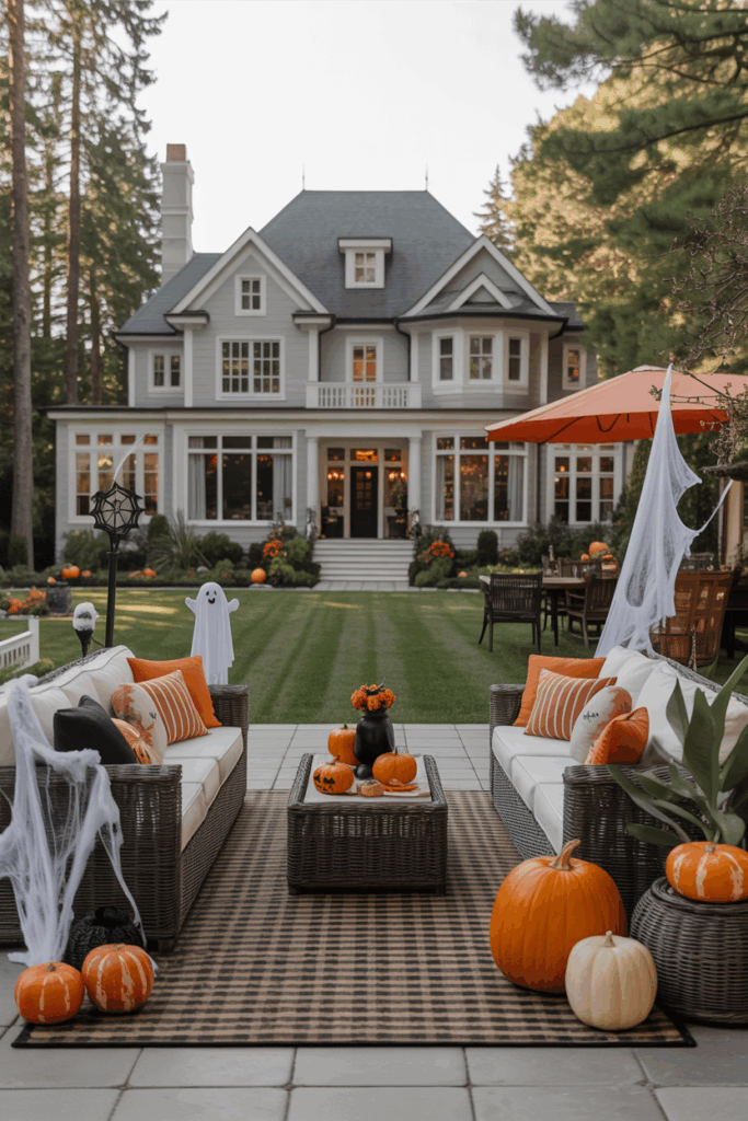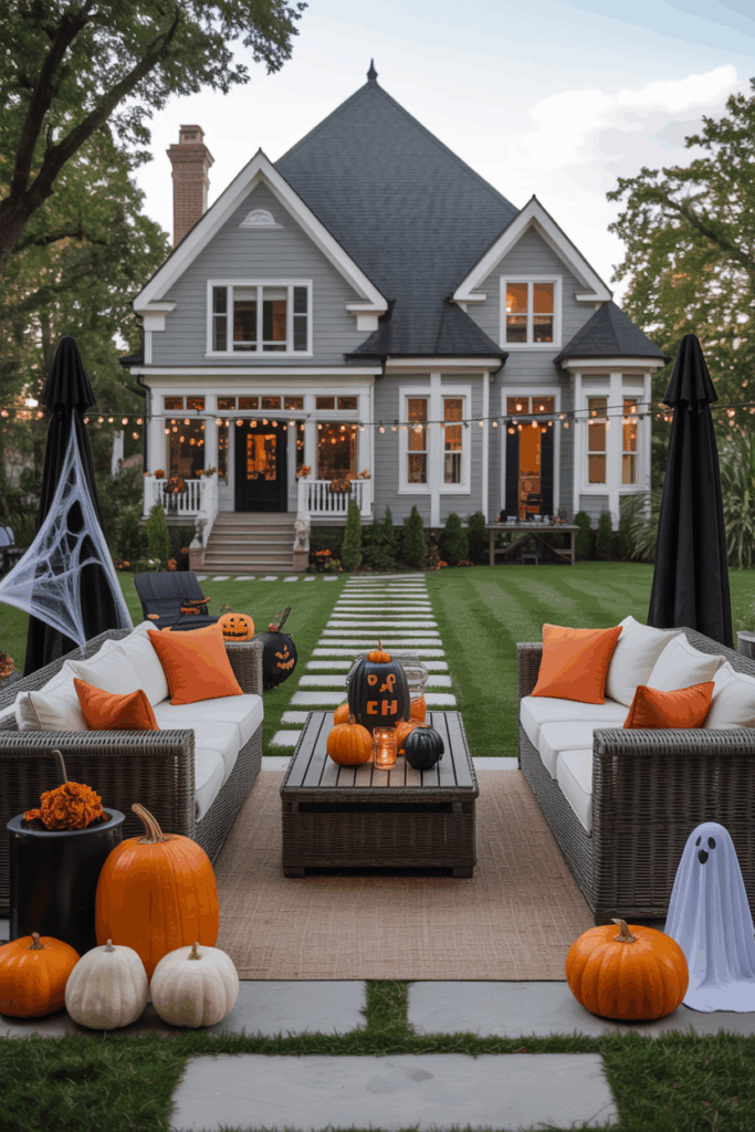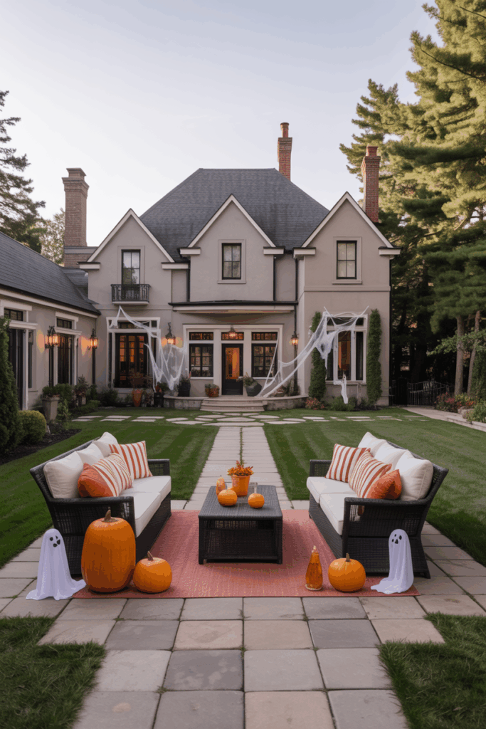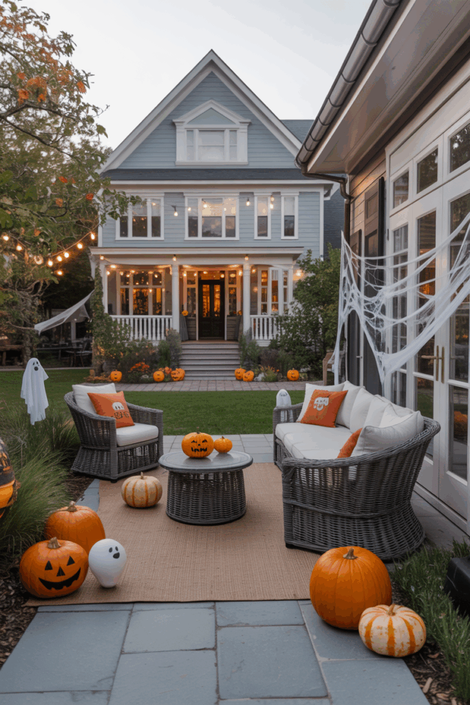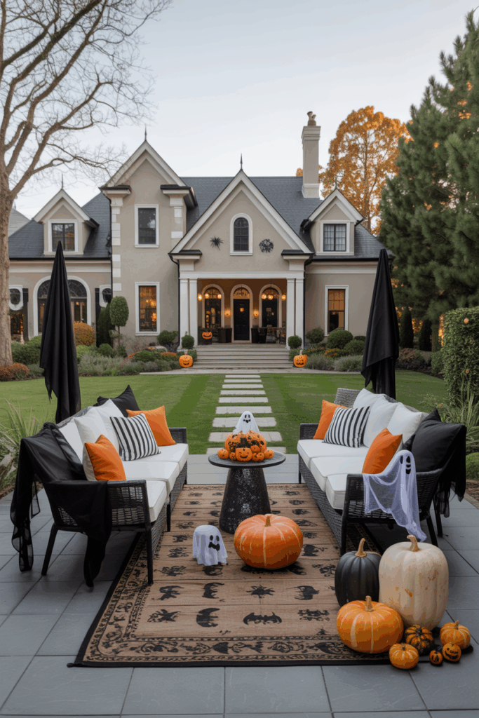 Turn a simple seating area into Halloween patio decor with a high-impact outdoor rug, orange-striped Halloween pillows, and a tight cluster of pumpkins on the coffee table and corners. Add two small ghost yard stakes, a few amber lanterns, and airy faux spiderwebs on the house to tie the backdrop to the patio. This look blends outdoor Halloween decorations, fall patio ideas, and autumn outdoor decor for a polished, party-ready courtyard, porch, or backyard.