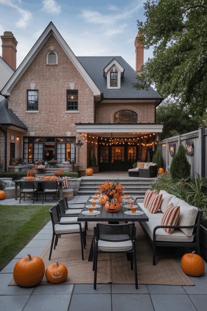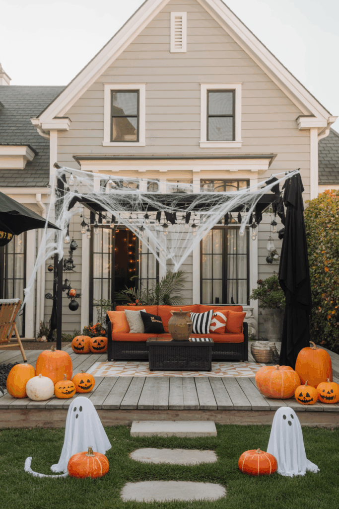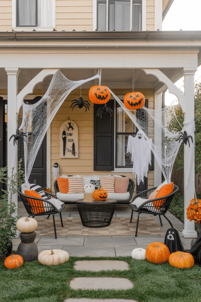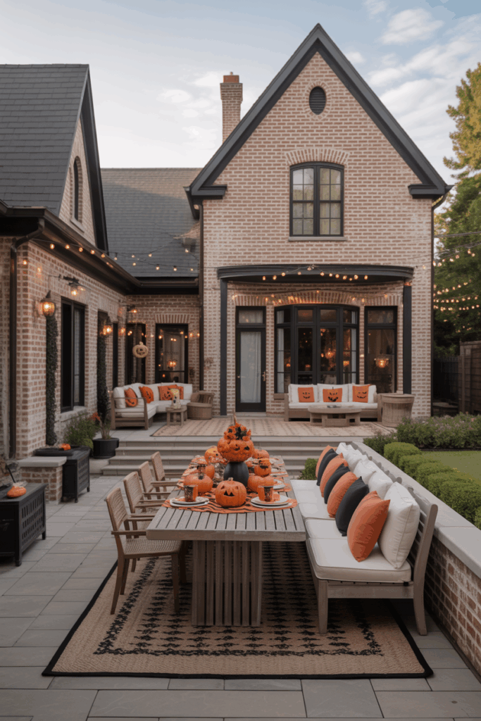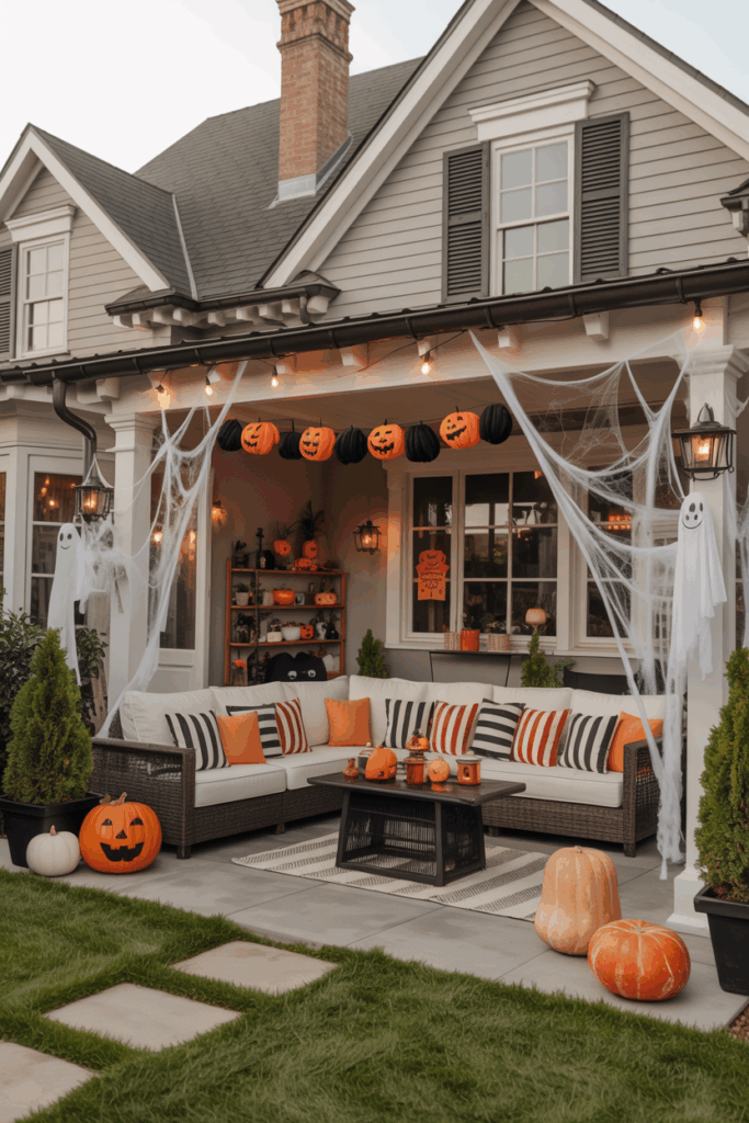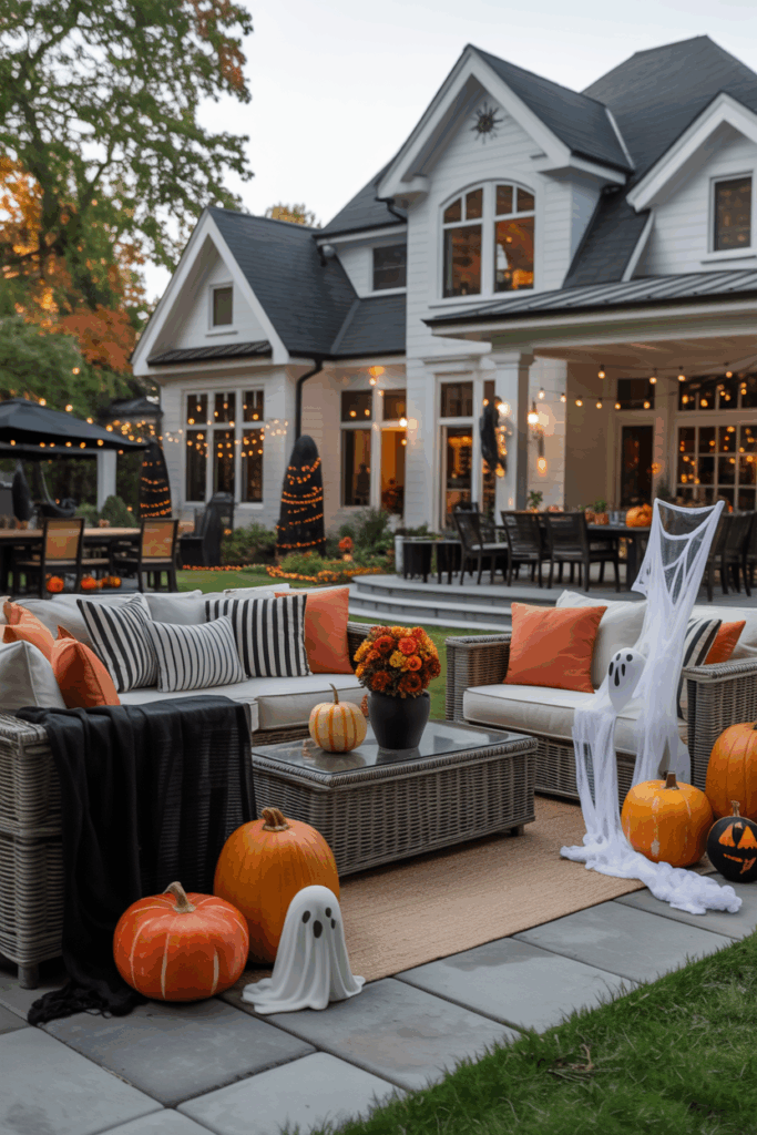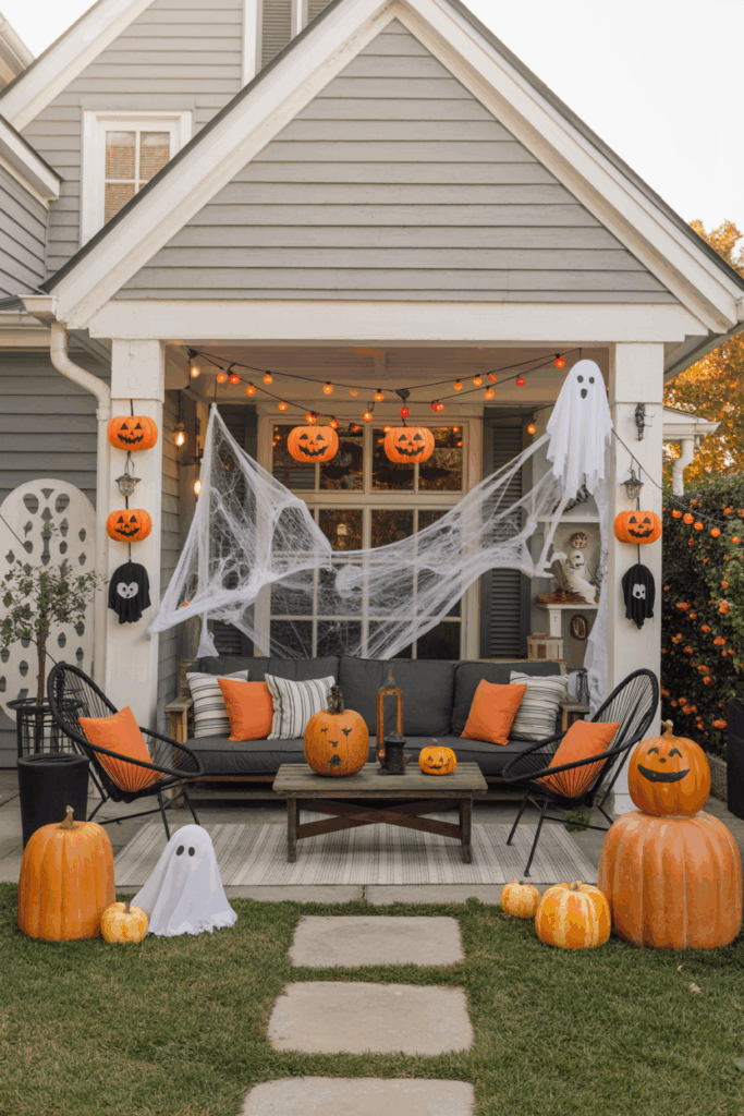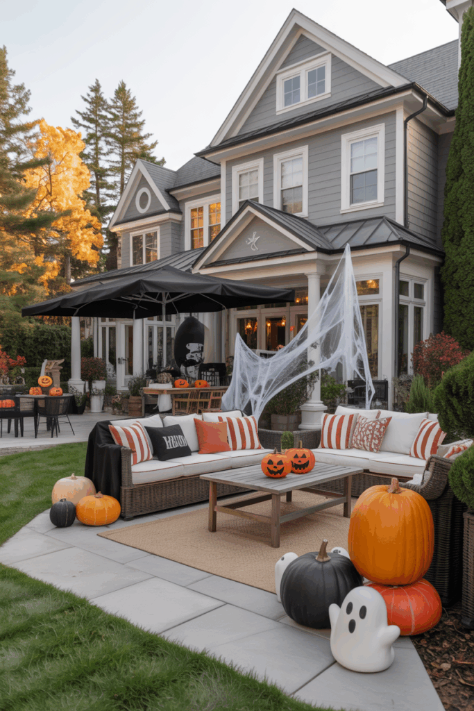 Turn a simple seating area into Halloween patio decor with a high-impact outdoor rug, orange-striped Halloween pillows, and a tight cluster of pumpkins on the coffee table and corners. Add two small ghost yard stakes, a few amber lanterns, and airy faux spiderwebs on the house to tie the backdrop to the patio. This look blends outdoor Halloween decorations, fall patio ideas, and autumn outdoor decor for a polished, party-ready courtyard, porch, or backyard.